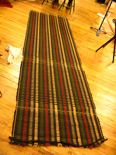 Here is a rug that I wove for my friend in Maine. It was fun and I wove a little barbed wire in this one just for giggles but I haven't heard if he found out yet. You see his feet are huge and I thought he would get a laugh out of it. Oh, and by the way those aren't banjo's they are just cardboard cut outs. It makes him feel better having them there.